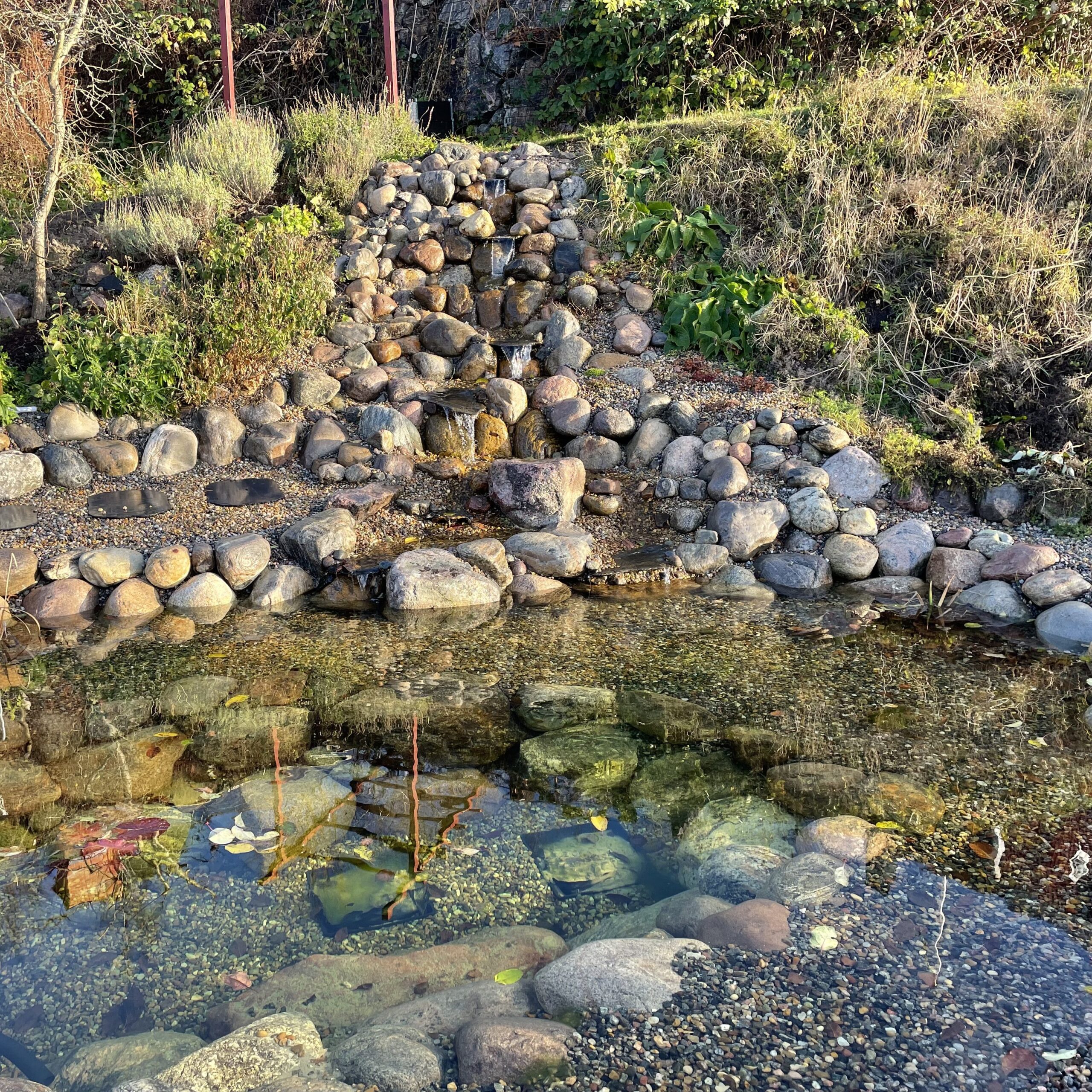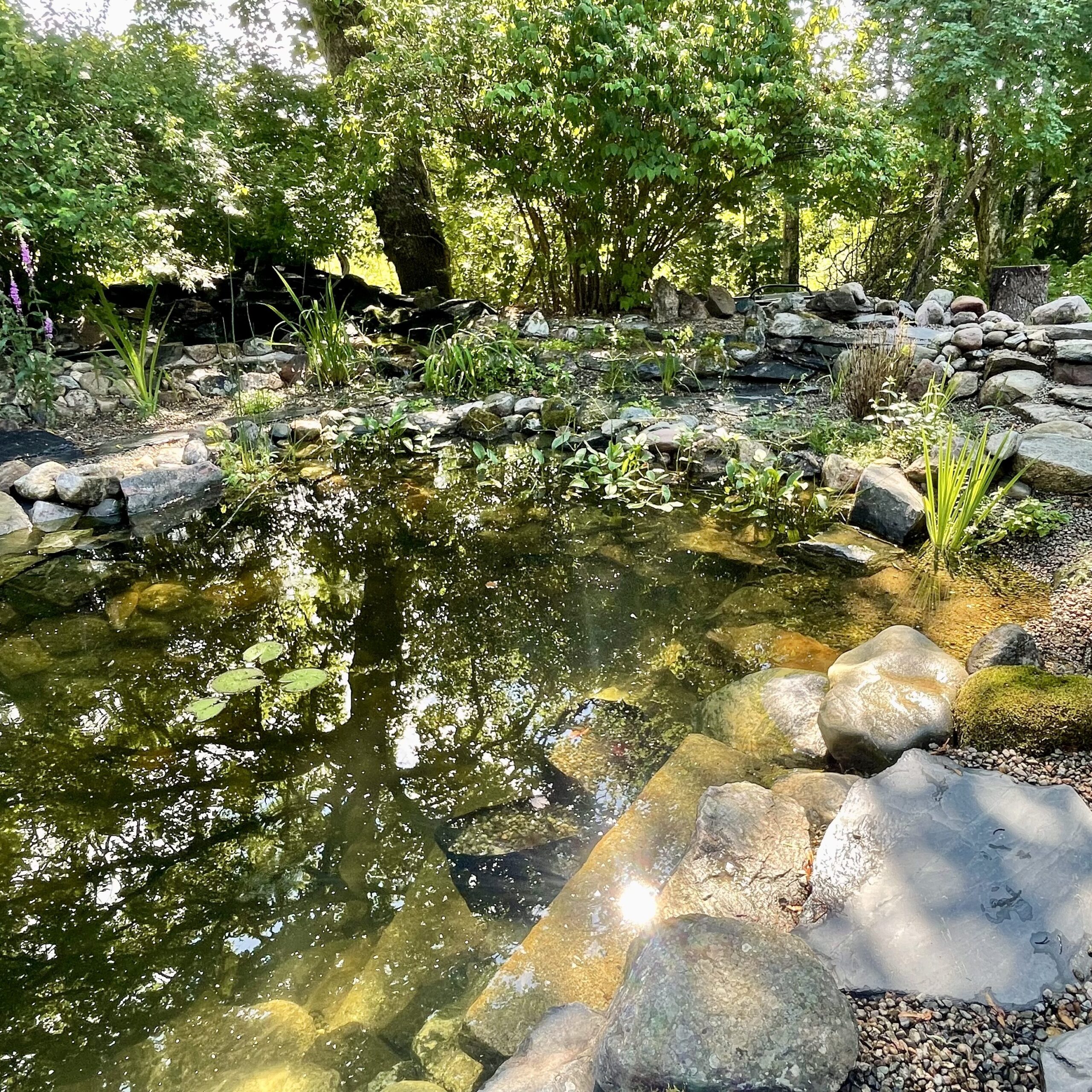 Vattenfall och biodiversitetsdamm i privat trädgård i Torpesta
