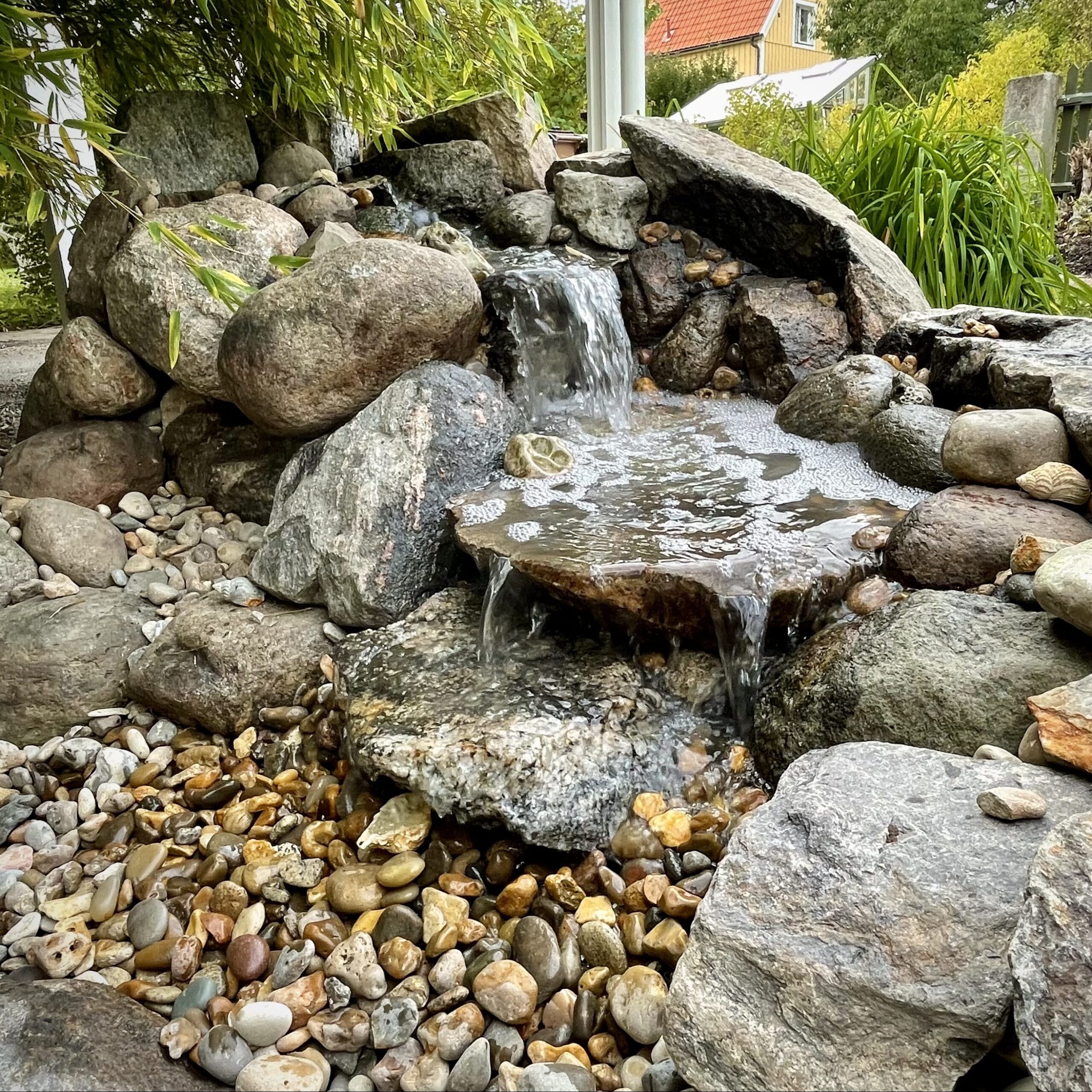 En naturlig vattenskulptur i privat trädgård i Mälarhöjden