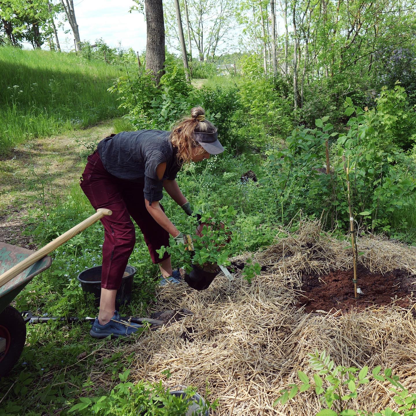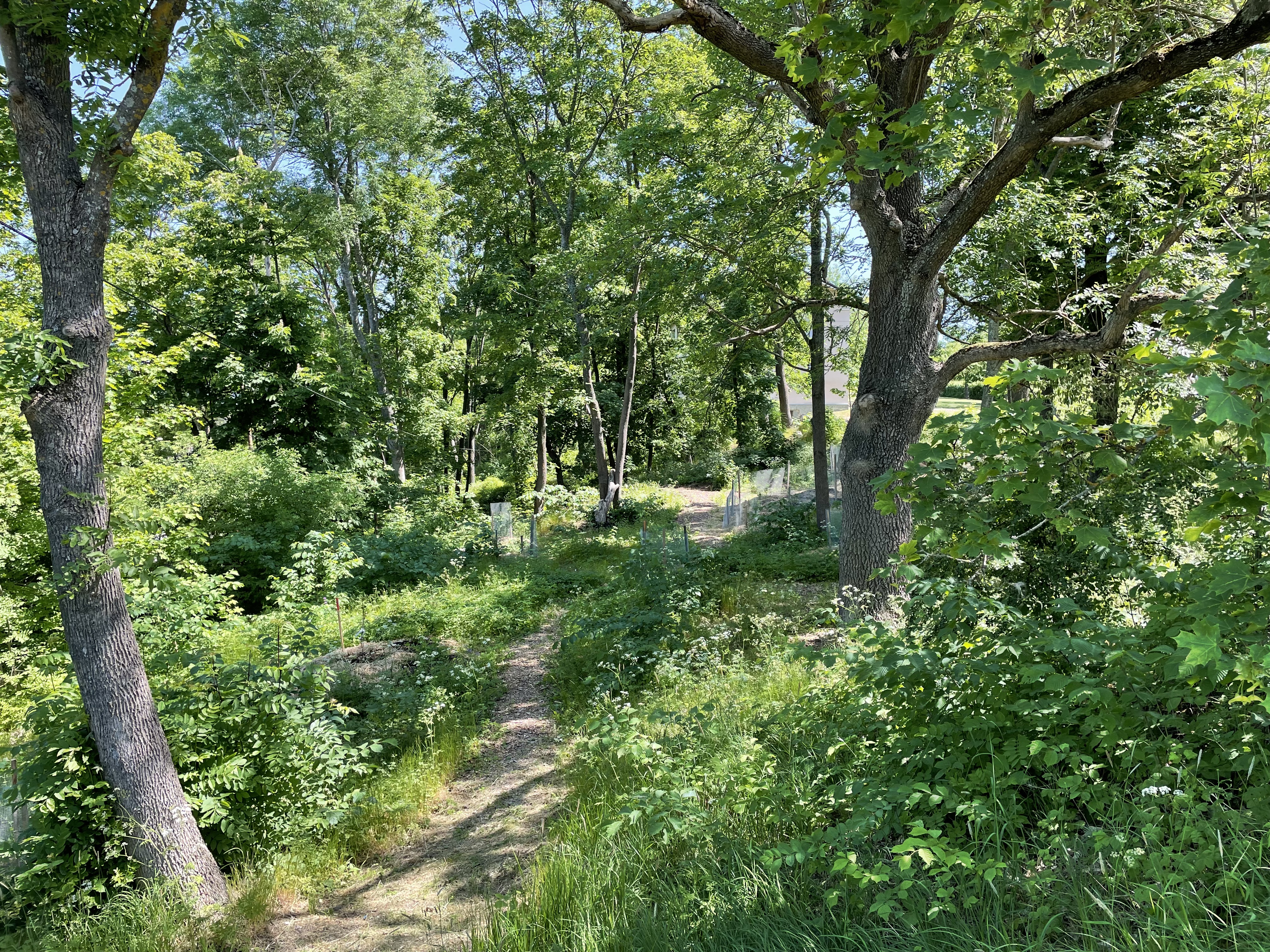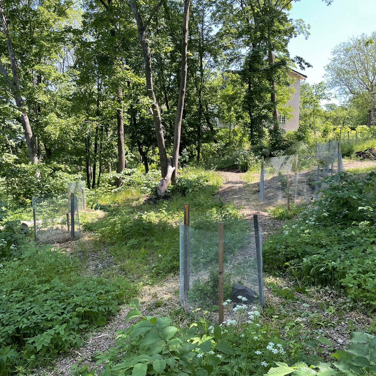 Längs kanterna av gläntan placerade jag låga till medelhöga träd och buskar samt en del lägre blommande, eller på andra vis vackra, ätliga, växter så som dagliljor, strutbräken och funkia. I mitten av området blev det ett litet snår med amerikanska blåbär och blåbärstry som uppskattas av såväl humlor som fåglar och människobarn.