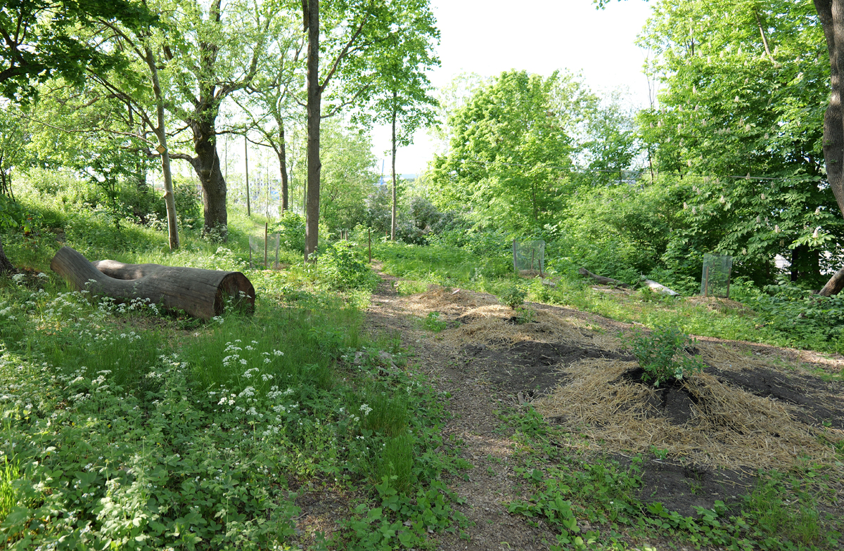 Jag ville ha in många spännande bär och frukter för både människor och fåglar att njuta av, eftersom det här utgör en liten oas i en annars ganska tätt bebyggd statsdel. Hit till Syltenberget kommer personer som bor i närheten för att promenera, njuta av lite natur och rasta sina hundar.