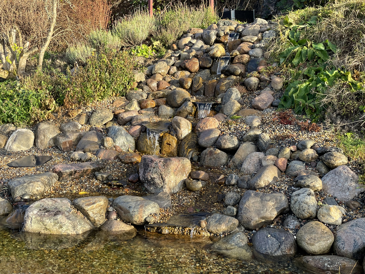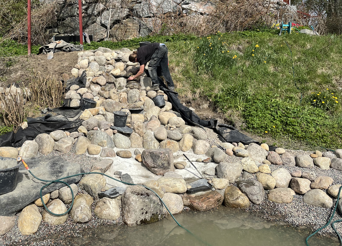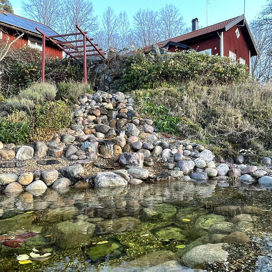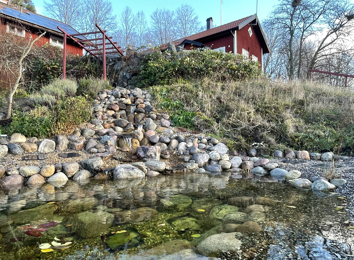 Kunden tyckte också att det vore roligt att göra något spännande med den branta slänten ner mot dammen så vi beslöt att bygga ett vattenfall i flera steg. Vi byggde fördämningar i anslutning till många av fallen, vilket uppskattas av fåglar som gärna badar och dricker där. Den ultimata målbilden är att vi får hit häckande strömstare till slut. Kanske är det ett ganska ambitiöst mål men det är trots allt roligt att designa utifrån andra arters potentiella önskemål. Ofta blir ju en naturlig design väldigt trivsam även för människor.