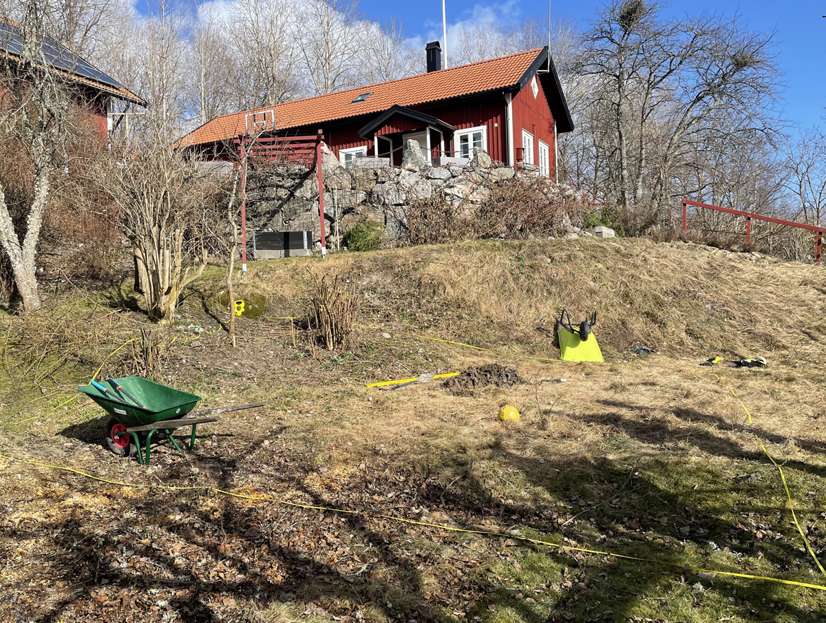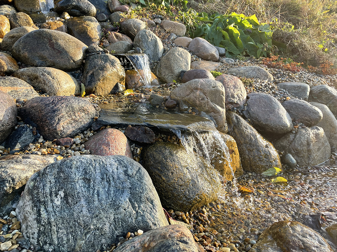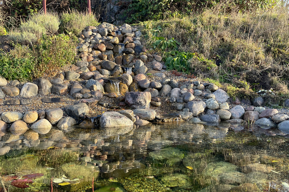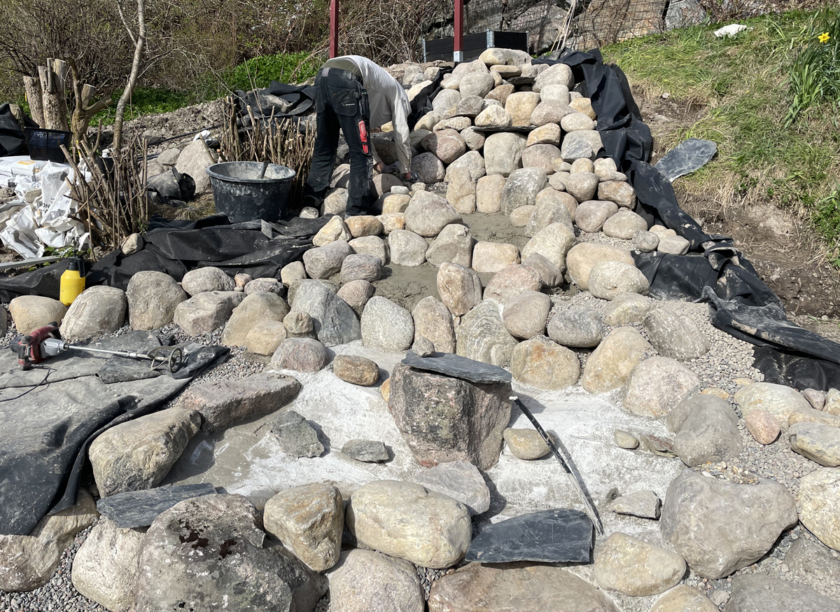 Kunden tyckte också att det vore roligt att göra något spännande med den branta slänten ner mot dammen så vi beslöt att bygga ett vattenfall i flera steg. Vi byggde fördämningar i anslutning till många av fallen, vilket uppskattas av fåglar som gärna badar och dricker där. Den ultimata målbilden är att vi får hit häckande strömstare till slut. Kanske är det ett ganska ambitiöst mål men det är trots allt roligt att designa utifrån andra arters potentiella önskemål. Ofta blir ju en naturlig design väldigt trivsam även för människor.